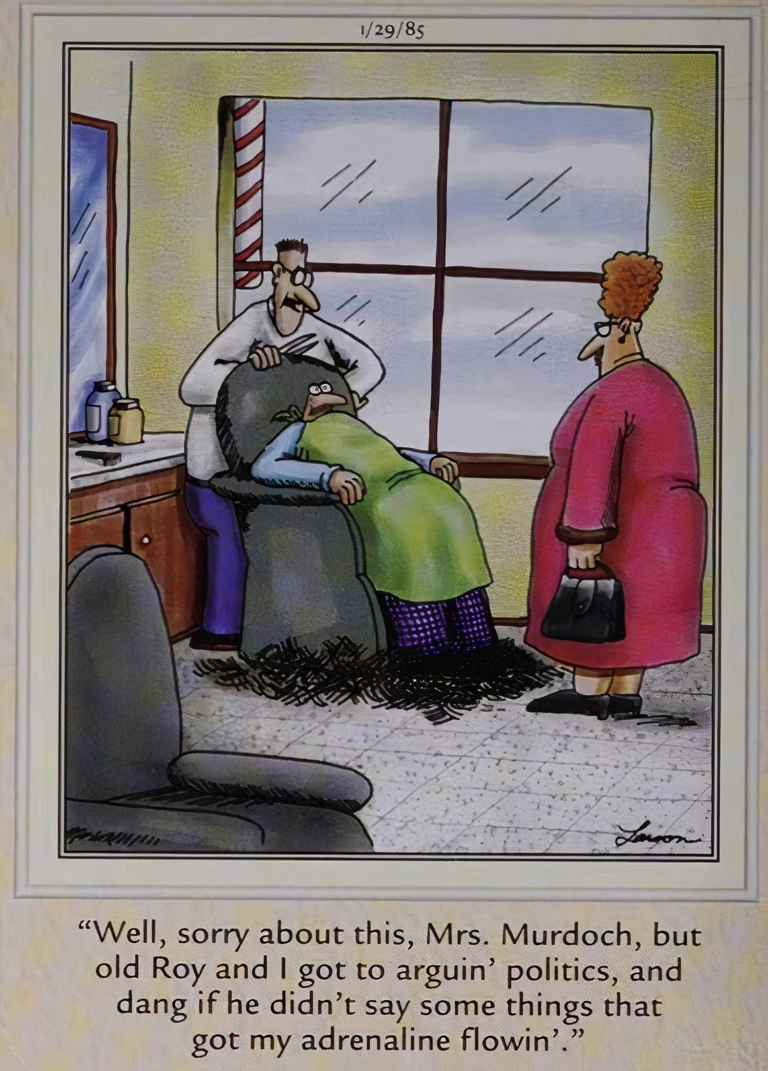 La broma probablemente solo Larson tome un escenario humorístico y lo lleva al extremo. ¿Pero eso es realmente todo? ¿Fue este un comentario más grande sobre cómo el discurso político puede afectar negativamente las relaciones laborales? O era El lado lejano Solo usando esto para recordarles a los lectores que no se encuentren a su barbero mientras estén en la silla?