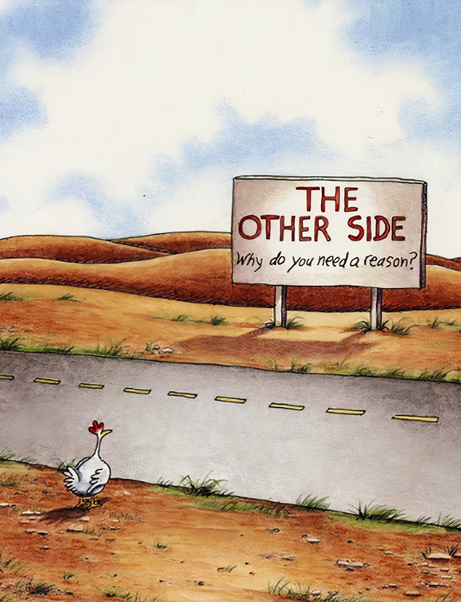 ¿El humor de esta tira lateral lejana proviene del pollo mientras boquita en una señal? ¿Eso lo tienta tanto? ¿O Larson está usando esta tira en un sentido más meta, preguntando al lector si realmente necesita una razón para saber por qué el pollo cruzó la carretera?