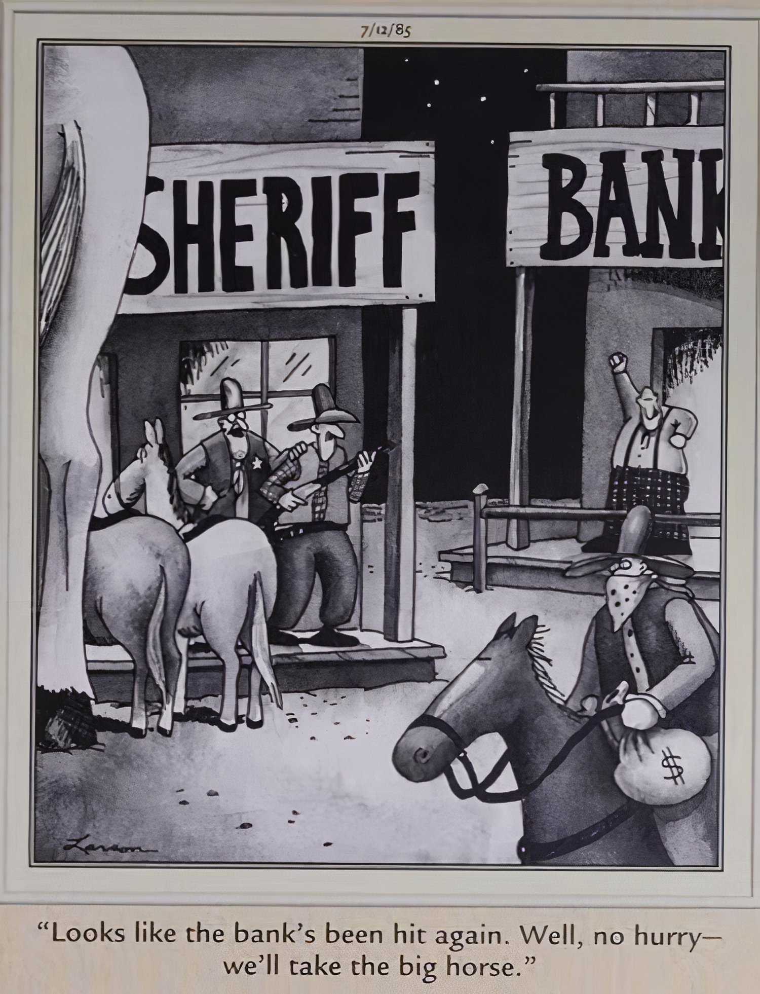 Alguno Lado lejano Las tiras son tan salvajes y afuera, los lectores no tienen más remedio que ir junto con la lógica en ellos. Esta franja está ambientada en los días del Salvaje Oeste y un ladrón de bancos acaba de salir con efectivo. El sheriff no parece demasiado preocupado por el robo, ni que el ladrón se está escapando, y señala a sus diputados que pueden tomar “el gran caballo“.
