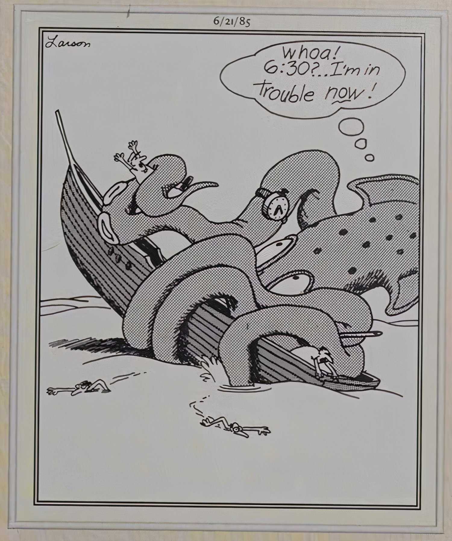 El lado lejano presenta un mundo donde lo mundano se encuentra con lo surrealistay nada dice eso mejor que esta tira poco convencional. Un barco está bajo ataque de un calamar gigante, y sus pasajeros están nadando por sus vidas. Sin embargo, el calamar se detiene en su ataque, señalando que ya son las 6:30 y que están en problemas.