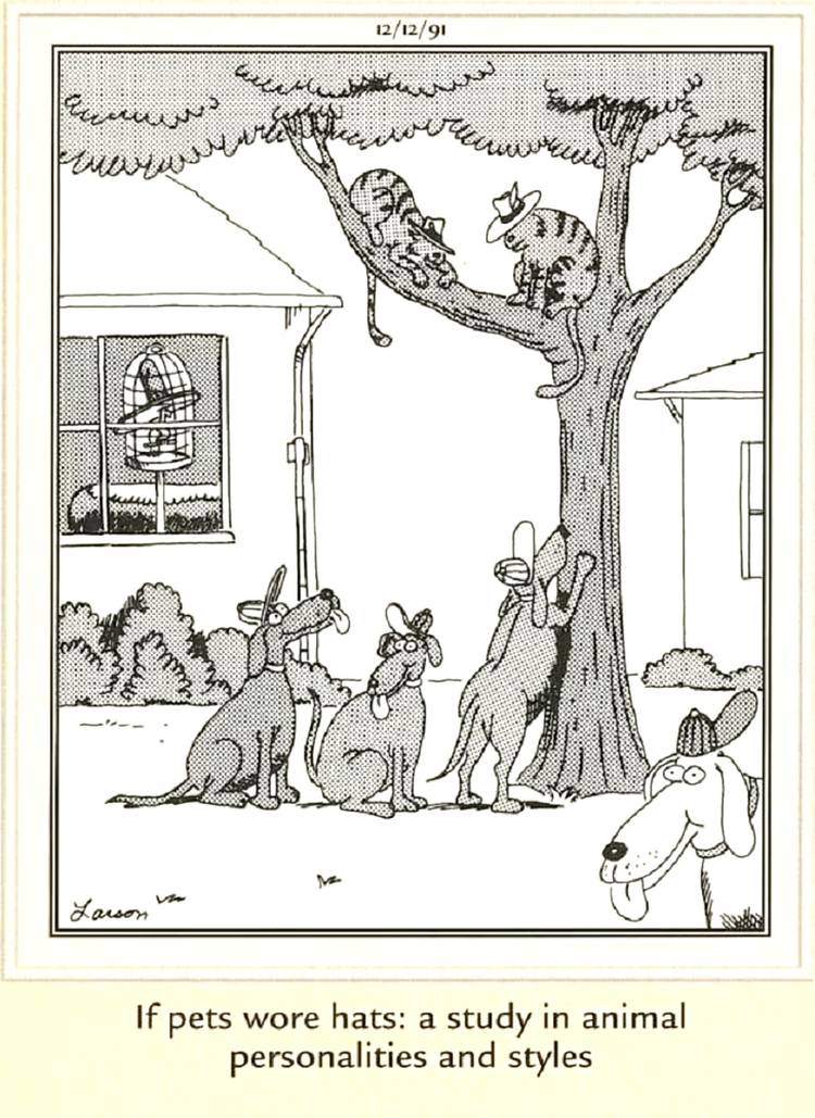 Si hay una cosa El lado lejano Lo hace bien, es antropomorfizar animales para una alondra. Si bien esta mordaza no tiene a los amigos peludos de la humanidad que mantienen trabajos o hablan de la vida, los humaniza de una manera particular. Esta tira plantea un estudio donde las mascotas usan sombreros. Los perros usan gorras de béisbol, los gatos usan sombreros y un pájaro dentro de una casa usa un sombrero demasiado grande para su jaula.