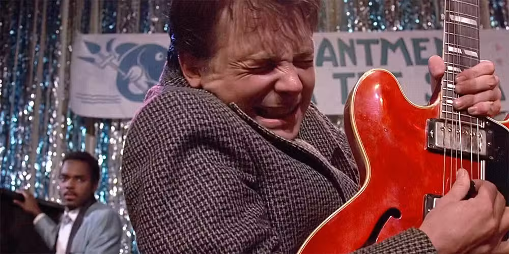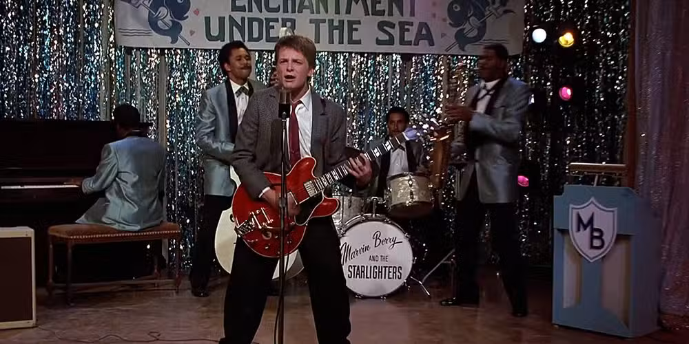 Mientras que “Johnny B. Goode” es un placer en Regreso al futuroMarty McFly pierde a la multitud cuando se deja llevar demasiado. Marty comienza a incorporar música más cercana a su propia época, copiando a gente como Angus Young de AC/DC, Pete Townshend de The Who y Jimi Hendrix. También realiza la técnica de tapping popularizada por Eddie Van Halen antes de mirar hacia un silencio atónito.