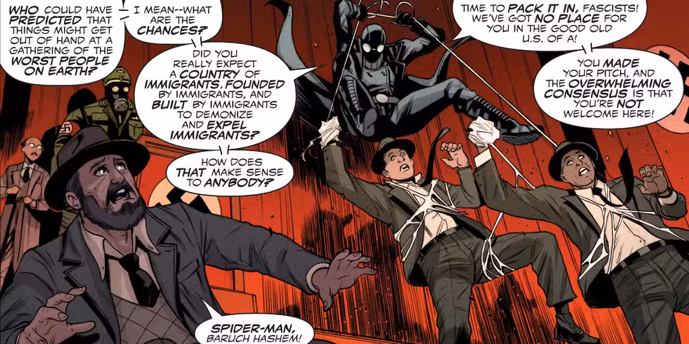 Sin duda, la secuencia destacada en Hombre Araña Negro #2 Es cuando Peter Parker es invitado a una versión del mitin nazi de 1939 en el Madison Square Garden.. Históricamente, el evento de la vida real atrajo a más de 20.000 seguidores (y, sin embargo, cientos de miles más protestaron contra el evento).