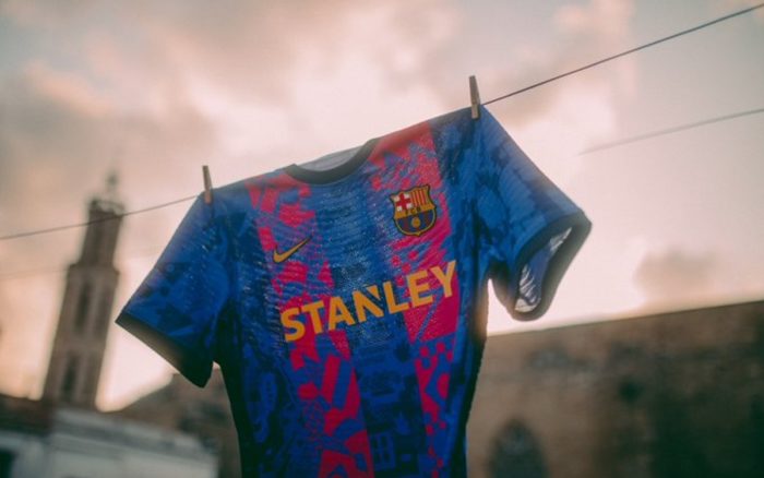 La nueva playera adopta las tradicionales franjas verticales en azul y rojo, pero con tonalidades neón e incorporando diferentes tramas de fondo que evocan cinco barrios de Barcelona: el Poble-sec, el Poble Nou, Gracia, el Raval y Les Corts.