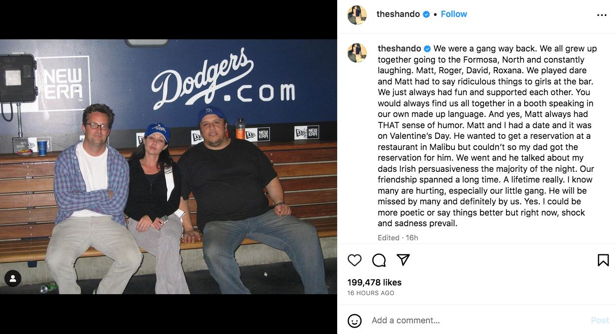 Estamos conmocionados y profundamente entristecidos por el fallecimiento de nuestro querido amigo Matthew. Todavía parece imposible. Todo lo que podemos decir es que nos sentimos bendecidos de haberlo tenido como parte de nuestras vidas. Era un talento brillante. Es un cliché decir que un actor hace suyo un papel, pero en el caso de Matthew, no hay palabras más ciertas. Desde el día en que lo escuchamos por primera vez encarnar el papel de Chandler Bing, no había nadie más para nosotros. Siempre apreciaremos la alegría, la luz y la inteligencia cegadora que aportó a cada momento, no sólo a su trabajo, sino también a la vida. Siempre fue la persona más divertida de la sala. Más que eso, era el más dulce, con un corazón generoso y desinteresado. Enviamos todo nuestro amor a su familia y amigos. Éste es verdaderamente aquel en el que nuestros corazones están rotos.