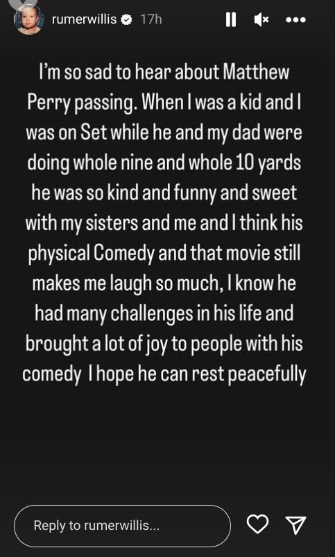 “/> En sus historias de Instagram, Rumer Willis (la hija de Perry Amigos y Los nueve metros completos coprotagonista Bruce Willis) compartió que “Sé que tuvo muchos desafíos en su vida y trajo mucha alegría a la gente con su comedia… Espero que pueda descansar en paz.“.