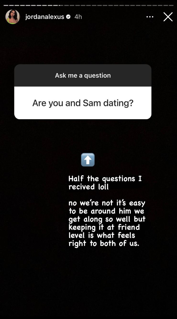La estrella de telerrealidad recientemente hizo una sesión de preguntas y respuestas en Instagram donde un fan le preguntó si ella y Sam eran pareja, y finalmente dio una respuesta. Jordana respondió: “No, no lo estamos. Es fácil estar cerca de él. Nos llevamos muy bien, pero mantenerlo a nivel de amigos es lo que se siente bien para los dos”. La estrella admitió que le hacen esa pregunta mucho ya que los dos están constantemente juntos y siempre parecen estar muy cerca. Sin embargo, dado que Sam también sale regularmente con muchas chicas en Instagram, era difícil saber si él y Jordana estaban realmente juntos.