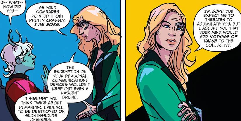 Siete de Nueve demostró una y otra vez ser un intelecto formidable, y ahora, cuando se enfrenta a la ignorancia y la corrupción, deja escapar uno de Star Trek quemaduras más graves. Los Borg asimilan casi todas las especies que encuentran. Sugerir que los Borg pasarían por alto a alguien para asimilarlo es una forma del siglo XXIV de insultar su inteligencia. Siete de los insultos de Nueve funcionan, ya que se meten bajo la piel del oficial corrupto, casi iniciando una pelea. El Los Borg encuentran algo que vale la pena tomar de cada uno que conocen, pero los fanáticos claramente no ofrecen nada.