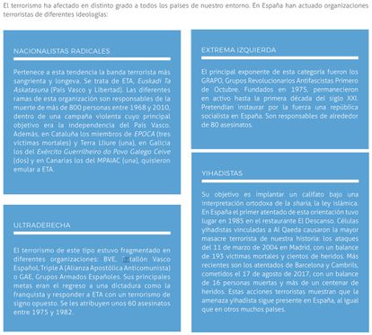 También se detallan los diversos tipos de terrorismo que ha sufrido España, con un desglose según la ideología de las diferentes organizaciones terroristas. Distingue, por ejemplo, entre nacionalistas radicales (ETA, Euskadi y Navarra, o EPOCA, Cataluña); extrema izquierda (GRAPO – Grupos Antifascistas Primero de Octubre); ultraderecha (BVE -Batallón Vasco Español- o Triple A -Alianza Apostólica Anticomunista- o GAE -Grupos Armados Españoles-) y yihadistas (Al Qaeda, Dáesh).