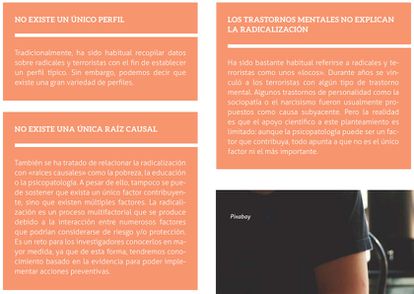 Por otra parte, se ahonda en el concepto de radicalización. Se intenta desmontar mitos como el que detrás de un terrorista hay una persona con un trastorno mental o que existe un perfil típico. Dos de las falsedades desmontadas desde hace años por los expertos en la materia. También se destierra la idea de una única raíz causal: “Se ha tratado de relacionar la radicalización con raíces causales como la pobreza, la educación o la psicopatología. A pesar de ello, tampoco se puede sostener que exista un único factor contribuyente, sino que existen múltiples factores”.