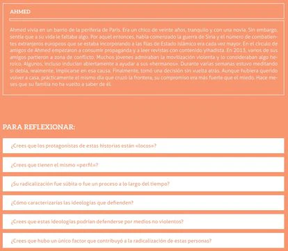 Todas las sesiones formativas incluyen actividades para hacer reflexionar al alumnado, para que se pongan en la piel de las víctimas, pero también para que conozcan la historia detrás de los terroristas. En los estudios de caso, se plantean tres supuestos, enmarcado cada uno de ellos en un tipo de terrorismo diferente. Por ejemplo, el de Ahmed: ¿cómo llega a convertirse un chico con una vida relativamente normal en un terrorista yihadista que combate en Siria en primera fila?