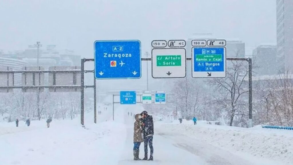 La foto fue tomada en las inmediaciones de la A2 a la altura de Avenida de América en la capital de España. Los dos enamorados se funden en un beso romántico dejando una postal de invierno para recordar. La autora, desde el día que subió la foto a redes sociales, busca a los dos protagonistas de la instantánea para entregársela y que tengan el mejor recuerdo posible del paso de la borrasca Filomena por nuestro país.