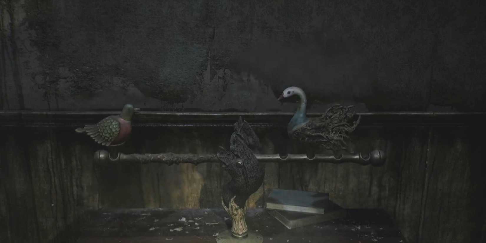 Tan pronto como pases a la siguiente habitación, la puerta de un gabinete se caerá de sus bisagras en línea recta. Esto revela el primer elemento que necesitas para el balancín: el Estatuilla de paloma. Continúe hasta la puerta de adelante para encontrar las figuras restantes.