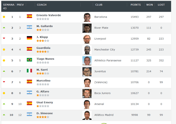 El argentino está ahora mismo décimo en esta clasificación. El club colchonero sólo ha ganado uno de los últimos seis partidos en Liga, por ejemplo, y eso ha hecho que el preparador esté ahora mismo el décimo entre los mejores.