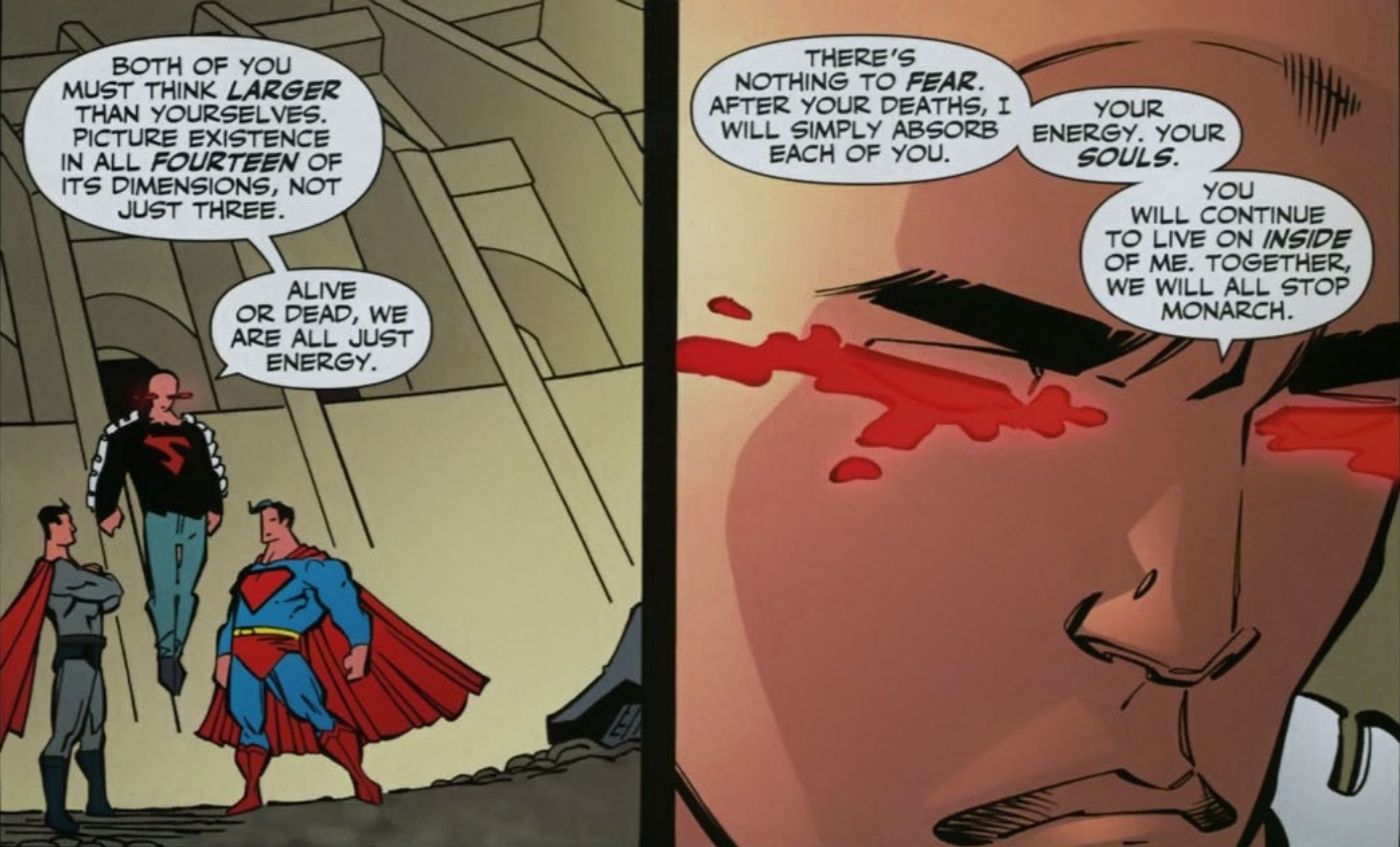 Es una idea aterradora que la ya enorme lista de poderes de Superman sea solo el comienzo de lo que realmente puede hacer. Si Superman aprendiera a extraer energía de cualquier fuente de energía, entonces su potencial sería ilimitado y tendría precedencia. Durante Superman: rojo/azul, por ejemplo, comenzó a utilizar los rayos como principal fuente de energía. Los diferentes tipos de luz solar, como los soles azules, le afectan de forma diferente. Parece que lo único que impide Superhombre utilizar las almas de las personas como fuente de energía es simplemente una falta de saber cómo hacerlo.