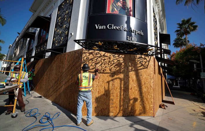 “Esperemos que todo esto sea innecesario”, dijo el lunes Kathy Gohari, vicepresidenta del Comité de Rodeo Drive, una asociación de comerciantes, mientras observaba a varios trabajadores clavando tablones de madera contrachapada en los escaparates de las tiendas de lujo.