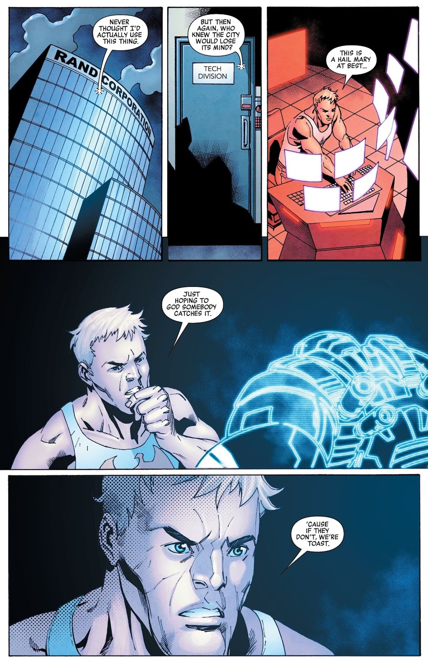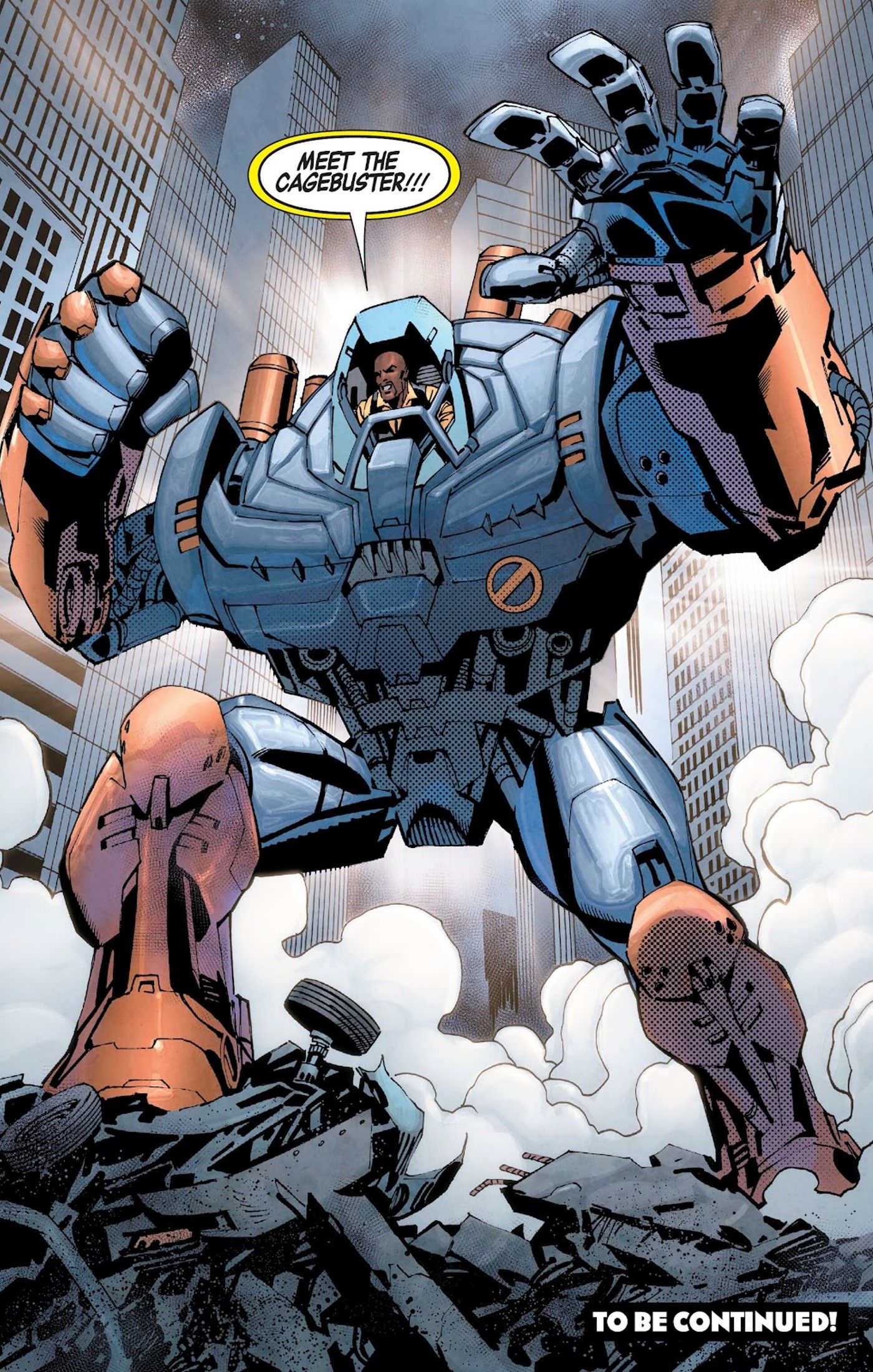 El director ejecutivo de Rand Corporations se retira a la división de tecnología de su empresa en busca de una misteriosa pieza de tecnología que Rand nunca pensó que tendría que sacar de su armario. Se lo muestra a Cage y admite que no tiene idea de si funcionará en su batalla, pero ambos coinciden en que, debido a que no tienen opciones, este es su último recurso. La página final del número revela que su última esperanza, que se creó bajo la supervisión de Danny, es un traje mecánico gigante construido para Luke Cage, llamado Cagebuster.