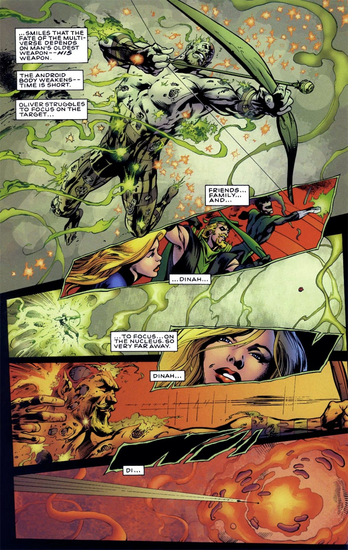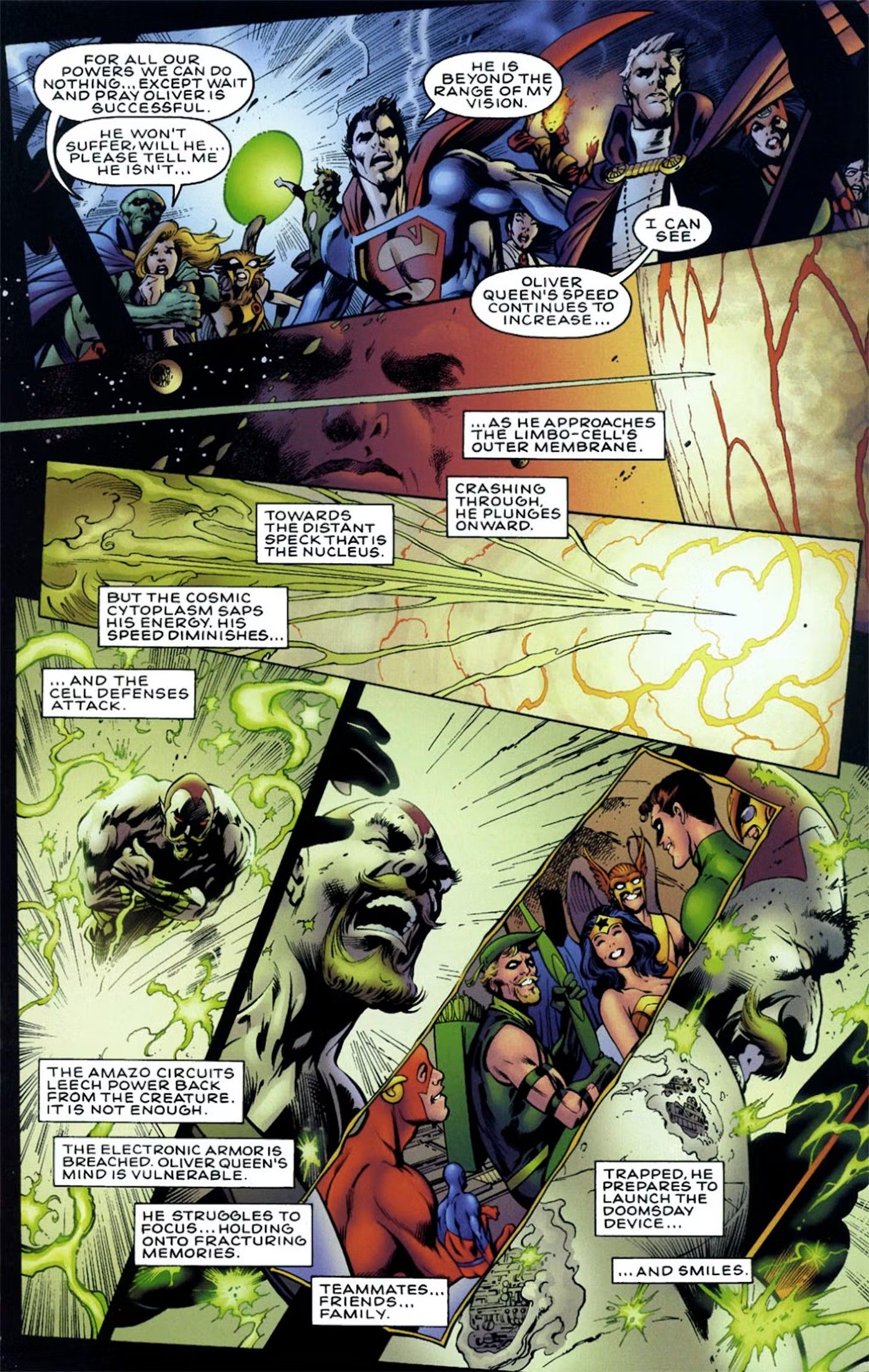Ollie se sacrifica para salvar el universo y sus compañeros héroes, haciendo lo que ni siquiera Superman pudo. Oliver Queen normalmente no tiene superpoderes. Lo que sí tiene que lo diferencia de otros héroes, además de un arco y algunas flechas con truco, es una fuerza de voluntad que le permite regresar una y otra vez de la derrota, las heridas devastadoras y las pérdidas aplastantes. Green Arrow ha sido golpeado, magullado y dejado sin dinero en varias ocasiones. Ha perdido amigos y seres queridos y, sin embargo, sigue luchando por la justicia. Sabe que no es tan poderoso como los otros miembros de la JLA. Sería el primero en admitir que es solo un humano con un traje verde y un palo, pero eso es lo que lo convierte en un gran héroe. No solo aporta una perspectiva fundamentada a los dioses y metahumanos del panteón de DC, sino que aporta la tenacidad y la persistencia de un hombre que no abandonará la lucha. Es este tipo de resiliencia lo que le permite redimirse y salvar el universo de una entidad que asustó incluso a Darkseid.
