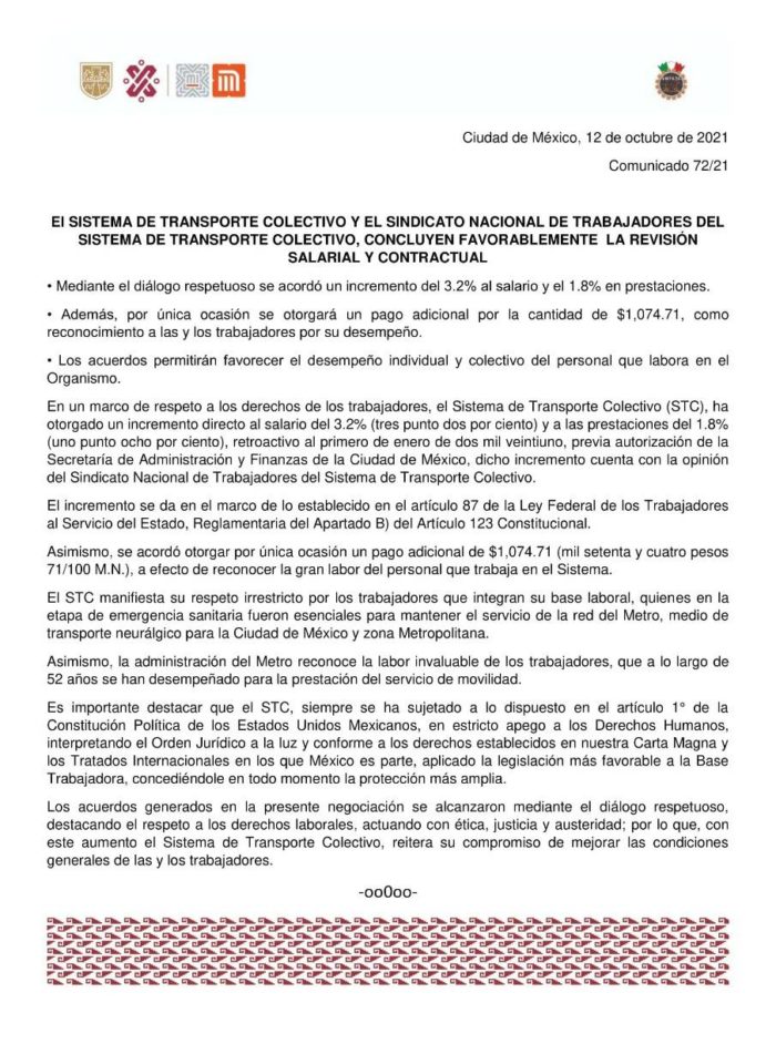 Mediante un comunicado, las autoridades del STC Metro indicaron que el aumento se da en el marco de lo establecido en el artículo 87 de la Ley Federal de los Trabajadores al Servicio del Estado, Reglamentaria del Apartado B) del Artículo 123 Constitucional, indicó.