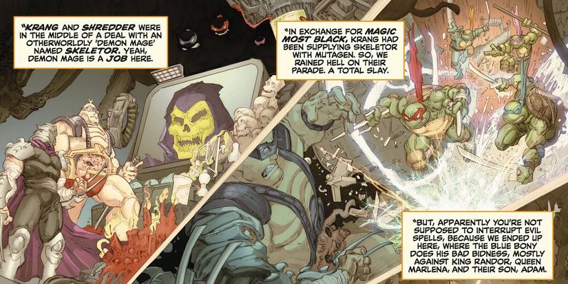 En Maestros del Universo/Tortugas Ninja: Tortugas de Grayskull #1 de Tim Seeley y Freddie E. Williams II, las Tortugas Ninja viajan a Eternia después de descubrir un siniestro complot. Shredder y Krang se estaban comunicando con Skeletor, enviándole mutágeno a cambio de acceso a la magia negra. Cuando las Tortugas interrumpen su canal de comunicación interdimensional, las TMNT Los héroes y villanos son absorbidos a través de un portal a Eternia.