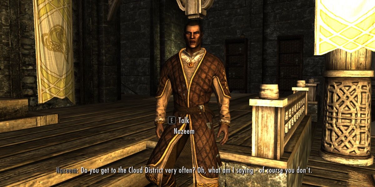 Nazeem es un NPC que deambula por Whiterun haciendo comentarios despectivos hacia y sobre otras personas, mientras que al mismo tiempo elogia sus supuestos logros, como “advis[ing] el Jarl en asuntos políticos “, porque su” aportación es invaluable, por supuesto “.