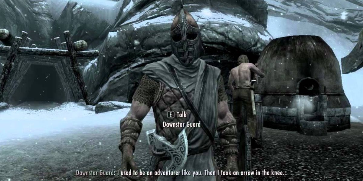 Si hay una cita que define Skyrim para un público que no es jugador, es un guardia al azar que culpa al estado actual de su carrera por haber recibido “una flecha en la rodilla”. Un alarde vacío con tanta profundidad como una jarra de hidromiel, pero no se puede probar que sea falso, y eso es lo que lo hace tan inolvidable.