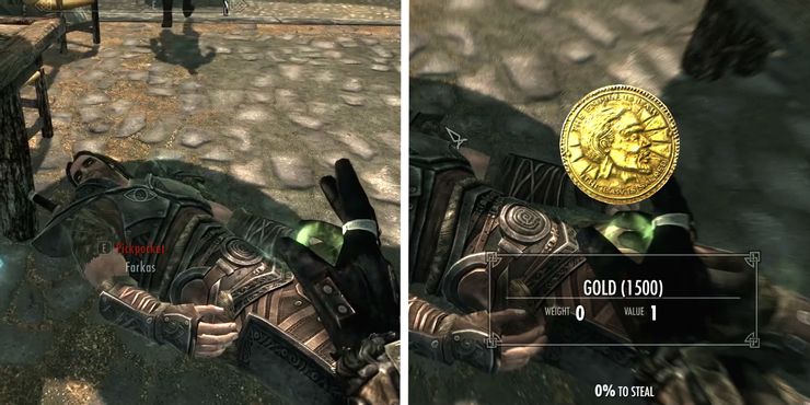 Un buen objetivo para esta técnica de carterista paralizador serían los entrenadores de habilidades que cargan al jugador con una cantidad terrible de oro para nivelar un rasgo en particular. Si bien presumiblemente sería más ético pagar la tarifa de su educación, aquellos cuyos monederos carezcan de oro suficiente pueden usar el método de carterista 0% en el NPC para recuperar su dinero.