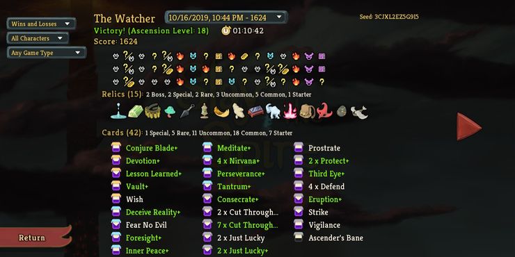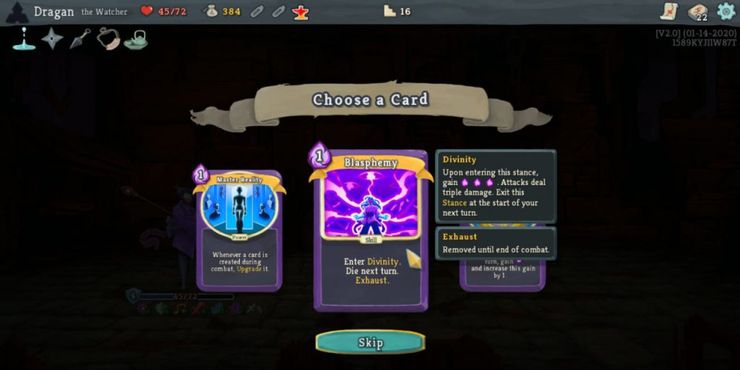 No solo se desbloquearán nuevos elementos para usar en el futuro, sino que algunas de las cartas y reliquias más fuertes del Vigilante están bloqueadas detrás de este sistema de progresión. Por ejemplo, esta es la única forma de desbloquear la carta supremamente poderosa Blasfemia, que le permite al Vigilante entrar en la posición de divinidad inmediatamente después de jugarla, triplicando su daño, pero a costa de morir en su próximo turno.