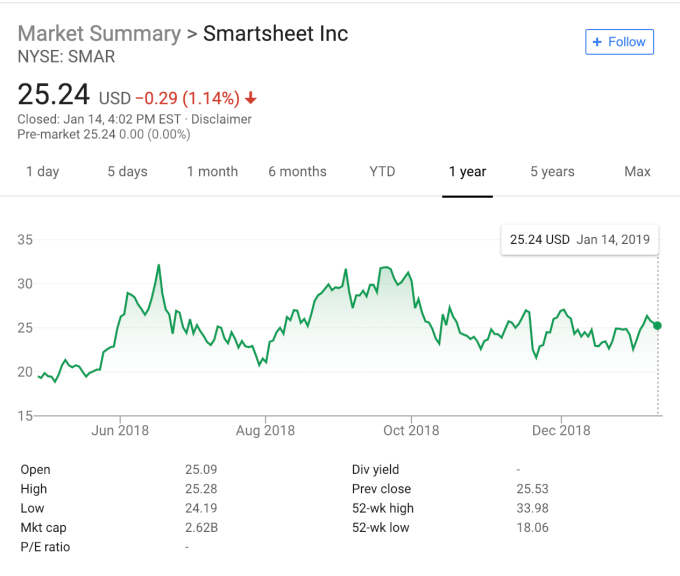 Smartsheet, que se lanzó en 2005, recaudó más de $ 113 millones antes de salir a bolsa en abril pasado. El precio de las acciones de la compañía se ha mantenido, ganando terreno en un mercado de valores volátil. Se encuentra por encima de su precio de lanzamiento de $ 19.50, cerrando en $ 25.24 ayer.