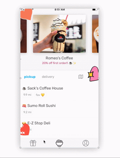 Snackpass ofrece a los usuarios una lista de restaurantes cercanos que pueden pedir con anticipación, con etiquetas especiales para aquellos que ofrecen ofertas. Los elementos del menú incluyen recuentos de cuántas personas los han pedido y cuántos puntos de recompensa ganarás comprándolos. Paga en la aplicación, omite la fila en el restaurante y toma su pedido del mostrador. Cada restaurante puede configurar su propio sistema de recompensas con la cantidad de artículos que ganan y cuestan, como darle un café gratis por cada 10 que compre.