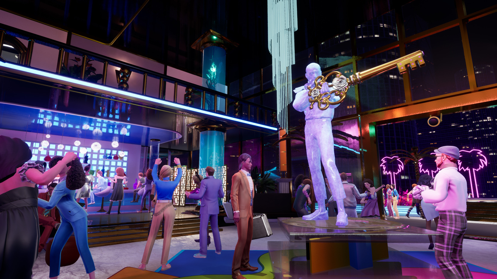 En el Key Heist, por ejemplo, primero necesitaba distraer a la multitud en la pista de baile, lo que elegí hacer al quitar el disco al jugador, pero también podría haber optado por algo como poner otro disco que atraería a los perros a la habitación. Del mismo modo, para extraer la llave de la estatua de hielo, opté por derretirla con luces calientes, pero podría haberla cortado o arrojado toda la estatua sobre el balcón. Para frustrar a los guardias a lo largo de la demostración, empleé una variedad de métodos, que van desde empujar a alguien a la piscina para derramar comida.