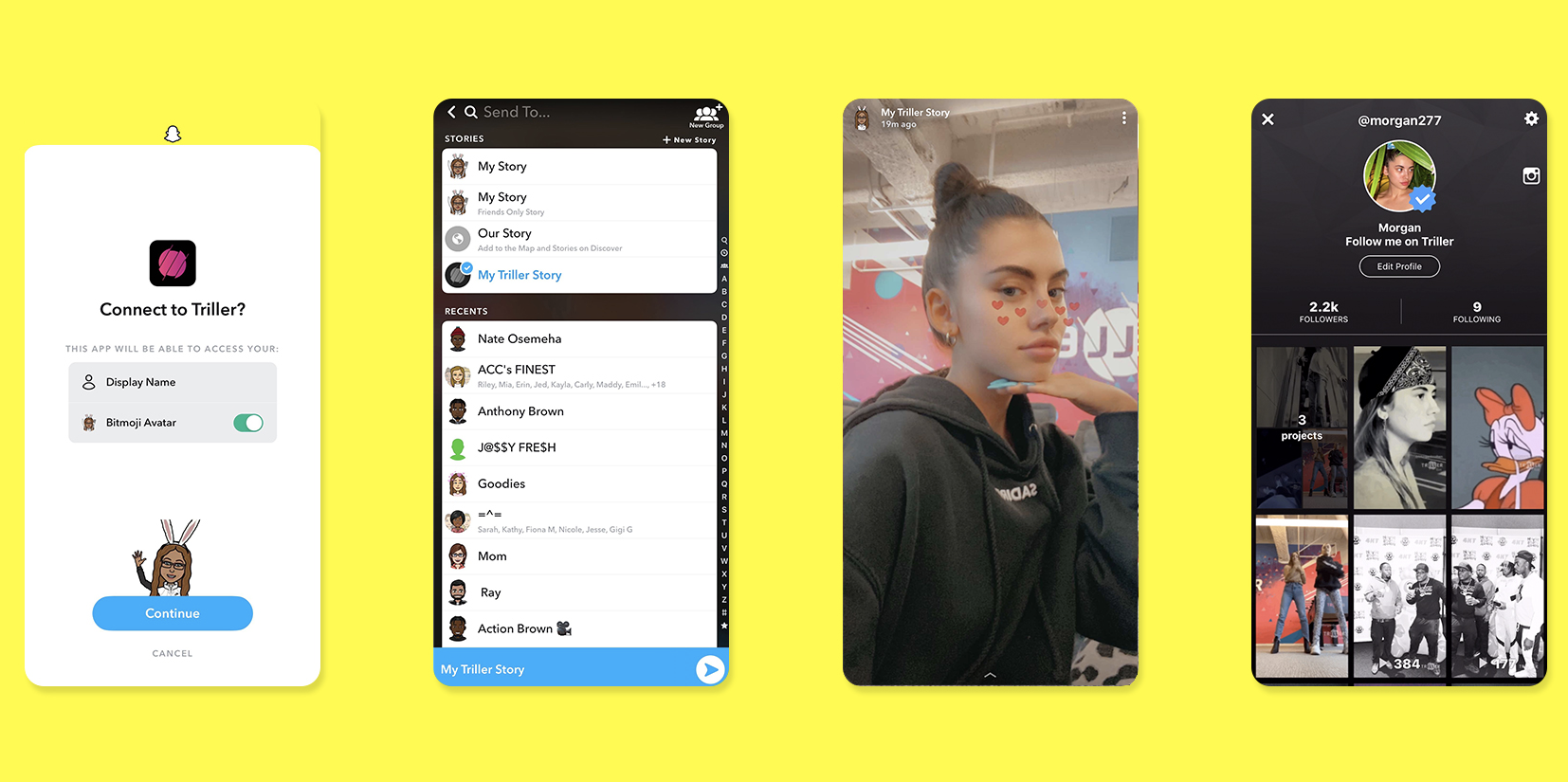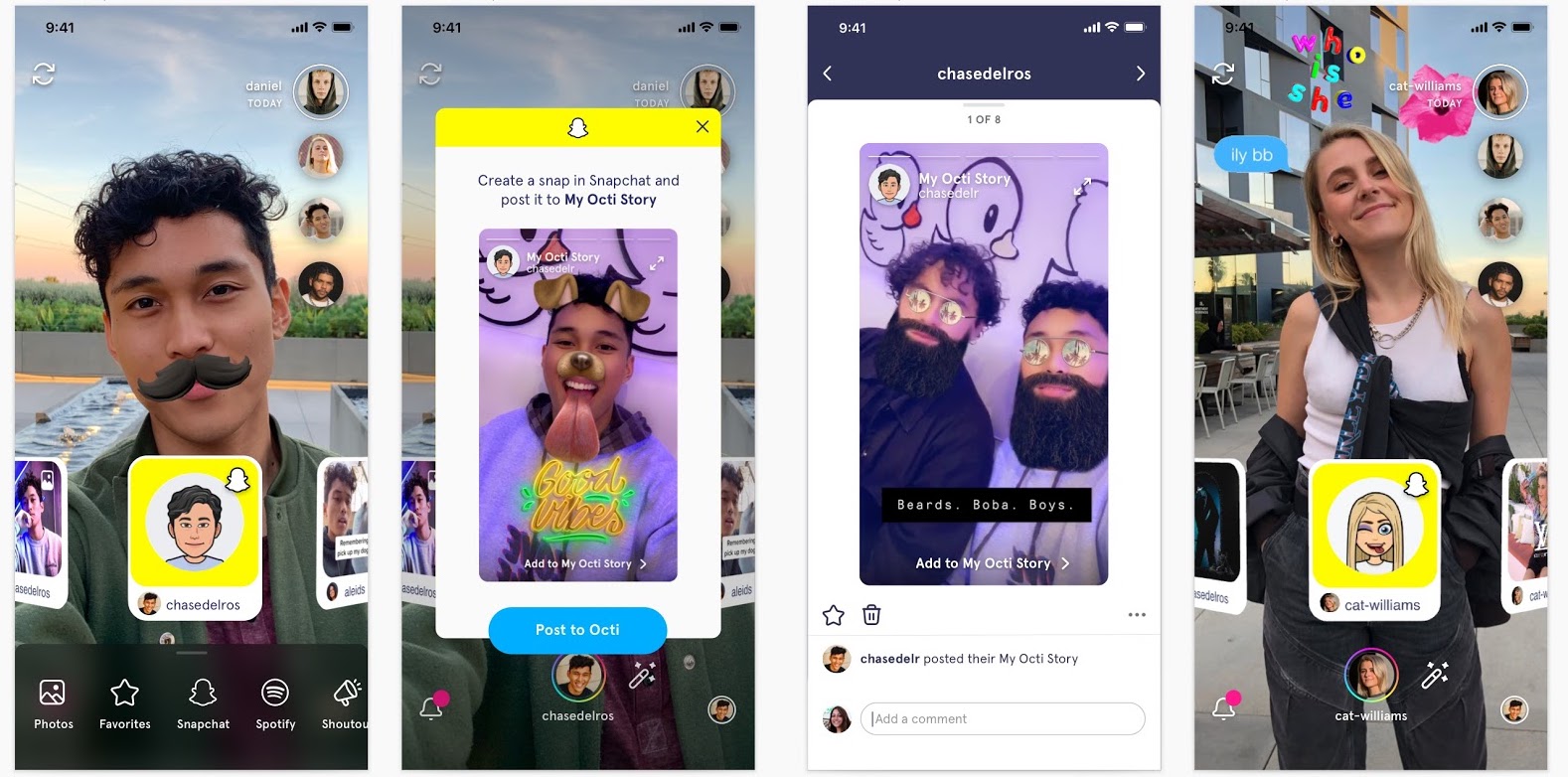 En Hily, Snapchat Stories reemplaza parcialmente la versión local que había creado mientras tanto para mostrar posibles fechas fuera de lugar en las vidas de las personas. En Triller, los usuarios pueden tocar la foto de perfil de un creador de contenido para ver historias biográficas en lugar de solo sus videos musicales pulidos. En escuadra, los usuarios pueden ver historias junto con otras cosas para compartir la pantalla. Y en Octi, los usuarios pueden ver la historia de Snapchat de alguien entre otros contenidos ocultos revelados por su cámara de realidad aumentada.