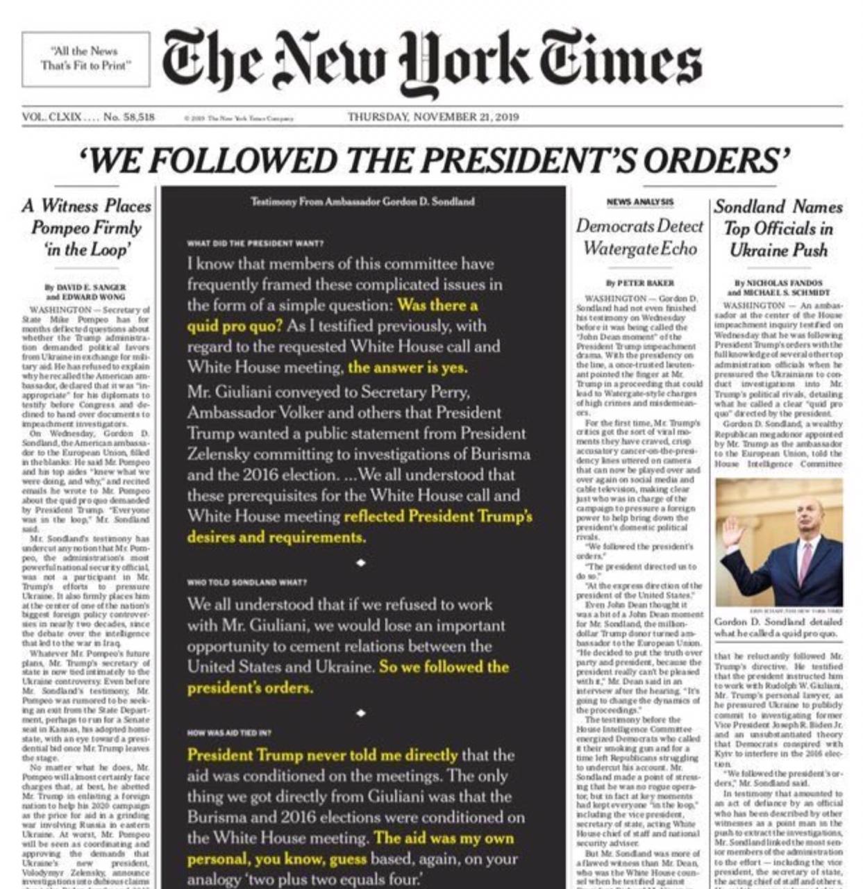 Al testificar en el cuarto día de audiencias públicas por la investigación de juicio político contra Trump, el diplomático admitió que hubo “quid pro quo” para que Ucrania investigara a Biden, principal aspirante a la candidatura presidencial demócrata, y a su hijo Hunter.
