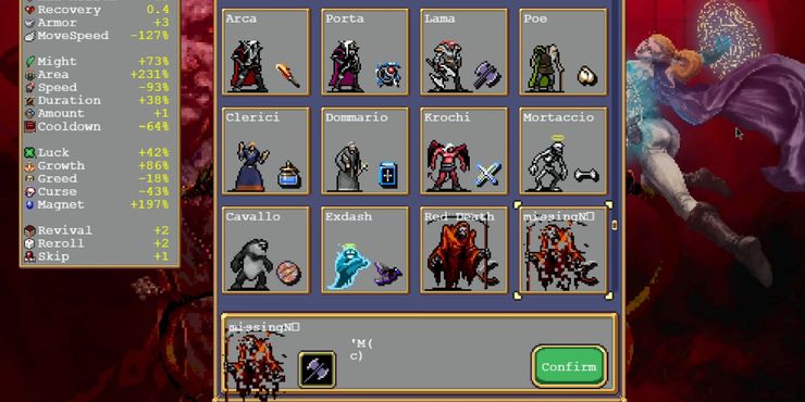MissingNo, también conocido como “missingNo” y “missingNo”, es un personaje jugable secreto en Sobrevivientes de vampiros que comienza cada etapa con estadísticas aleatorias y el Hacha o Espiral de la Muerte como arma inicial. No hace falta decir que jugar a missNo es bastante caótico, ya que el personaje está destinado a ser una especie de problema técnico con su atributo de inicio único. Debido a la impracticabilidad del juego y a los problemas de equilibrio de este personaje secreto en Sobrevivientes de vampirosel desarrollador decidió eliminar MissingNo en el parche 0.2.12, reemplazándolos en su lugar con Mask of the Red Death, también conocido como Red Death.
