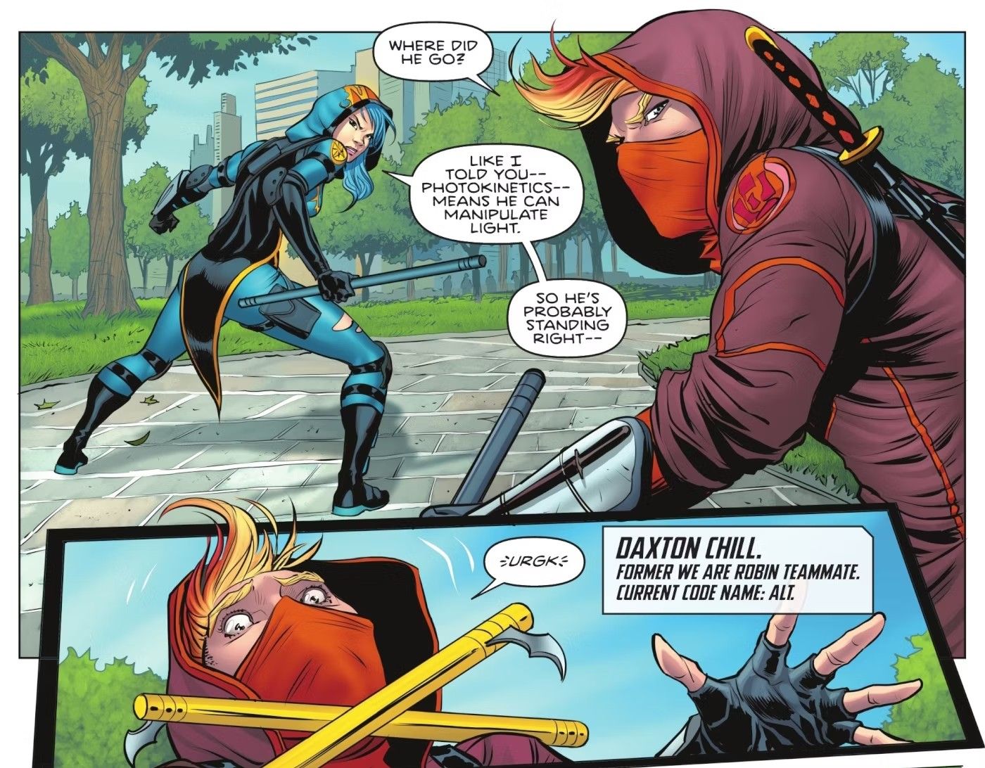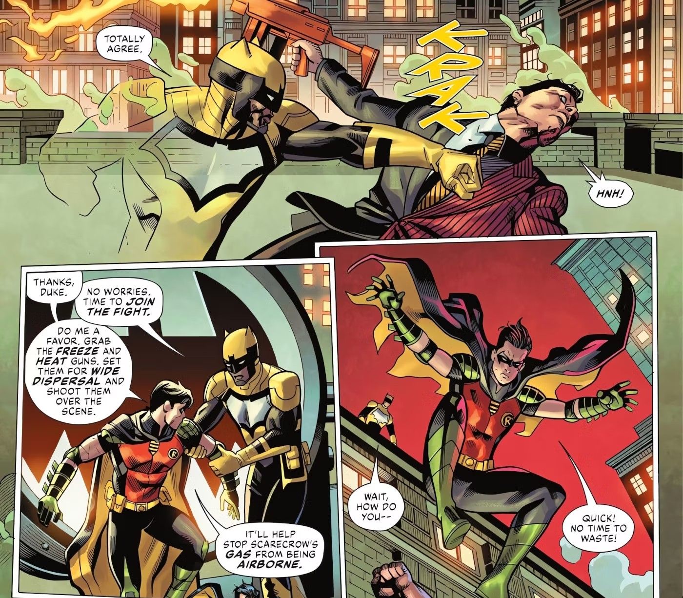 “/> Mientras la Bat-Familia lucha por luchar contra los villanos mejorados en la calle, Tim es rehén arriba. Si bien al principio parece desesperado, Duke Thomas puede colarse fácilmente y liberar a Tim, todo sin el uso de ningún dispositivo, gracias a sus poderes de manipulación de la luz y la oscuridad.