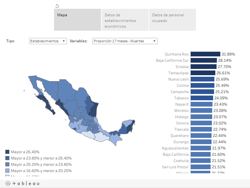 La mayor proporción de muertes de establecimientos formales ocurrió en Quintana Roo y Campeche con 28.9 por ciento y 24.9 por ciento, respectivamente. Las entidades con más muertes de establecimientos informales fueron Baja California Sur (34 por ciento) y Quintana Roo (33.6 por ciento).