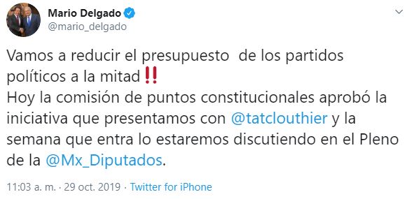 No obstante, el presidente de la Junta de Coordinación Política (Jucopo) de San Lázaro, Mario Delgado, se mostró confiado en su cuenta de Twitter, al anunciar el avance de dicha iniciativa.