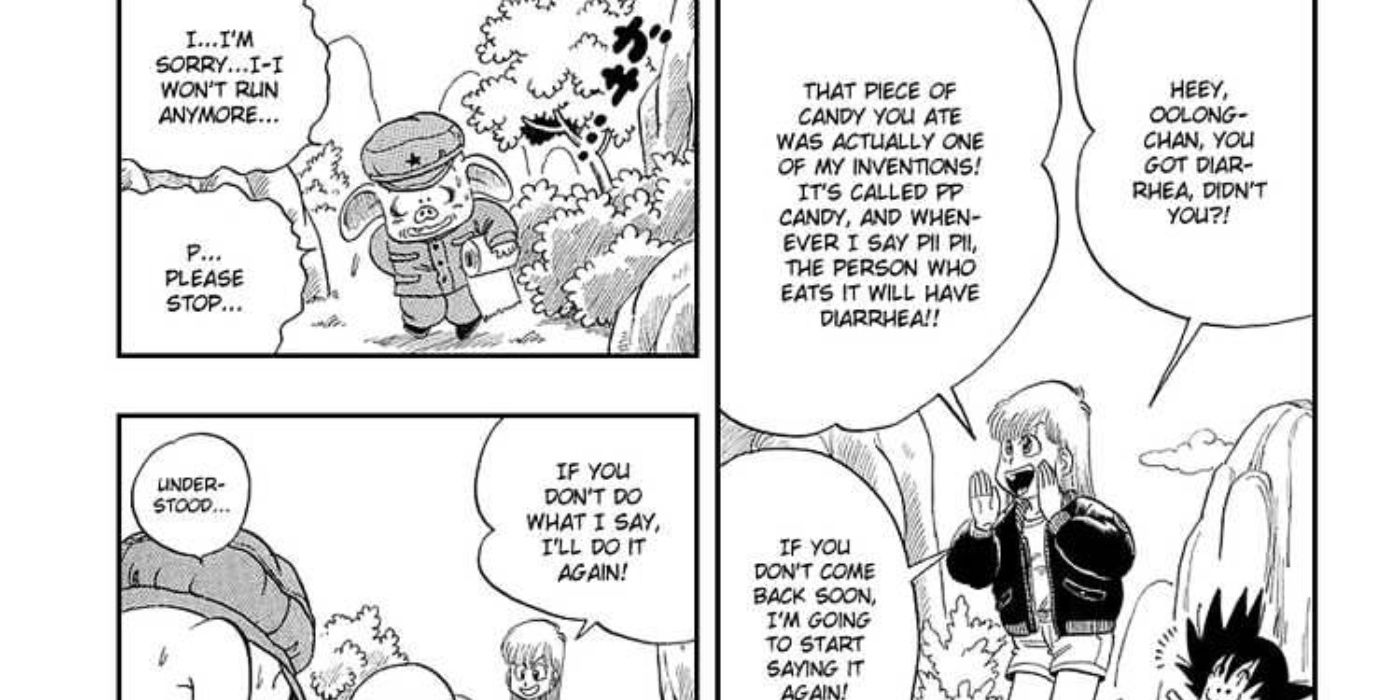 En el capítulo #7 del original esfera del dragón, Bulma, Goku y Oolong viajan por el mundo en busca de las Dragon Balls. Mientras Goku y Bulma comenzaron este viaje juntos, los dos recogieron a Oolong en el camino, ya que Bulma creía que su cambio de forma sería útil. Sin embargo, Oolong estaba tramando en secreto su escape, porque no quería involucrarse con estos dos aventureros que recientemente terminaron su reinado malvado en un pequeño pueblo. Antes de que Oolong decidiera huir, Bulma le dio un dulce que Oolong consumió sin pensar. Cuando Oolong trató de escapar, Bulma pronunció la frase “Pii Pii” y Oolong instantáneamente contrajo un caso de diarrea violenta que lo detuvo en seco.