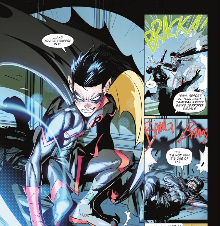 Cuando los soldados entran en Wayne Manor, Damian envía rápidamente a los soldados que fueron elegidos explícitamente por Waller para esta tarea.. Estas fuerzas militares seguramente esperaban enfrentarse a Batman, lo que hacía de esta batalla una muestra absurda de las habilidades del joven Robin.