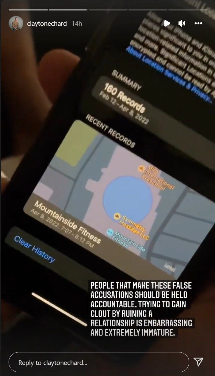En Instagram, Clayton rápidamente cerró las afirmaciones de Sasha de que la conoció en Nueva York alrededor de las 2 am del sábado 9 de abril “.Ni siquiera puedo creer que me esté refiriendo a esto, esto es ridículo“, dijo. Clayton mostró en su teléfono que estaba en Mountainside Fitness, que solo tiene ubicaciones en Arizona, con su amigo el viernes 8 de abril, hasta las 8:12 p. m. MST, o las 11:12 p. m. en Nueva York. Esto le habría dado a Clayton un tiempo limitado para llegar al aeropuerto y abordar un vuelo a la Gran Manzana. También publicó una conversación con Sasha a través de DM, en la que ella dijo: “Tu prueba no es prueba lmaoClayton respondió:Entonces, incluso si me subiera a un jet privado, no llegaría a NY hasta las 3:30 a.m. EST (el vuelo de AZ a NY es de 4 1/2 horas.”