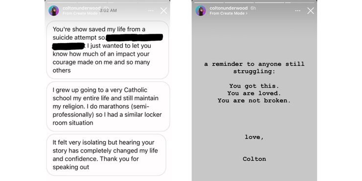 Como se ve en las capturas de pantalla a continuación, Colton recibió un mensaje donde un fanático le explicaba el impacto que saliendo colton tenido en su vida. El aficionado escribió, “Tu programa me salvó la vida de un intento de as*icidio, así que solo quería que supieras cuánto impacto tuvo tu coraje en mí y en muchos otros”. Esta persona señaló que ha crecido en un ambiente religioso y también ha practicado deportes, lo cual es muy similar a la historia de Colton. Este fan concluyó diciendo que ver la serie de Netflix “Cambió mi vida y mi confianza”. En su última historia de Instagram de esta serie, Colton les recordó a sus seguidores que son amados y que no deben sentirse rotos.