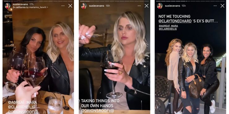 El miércoles 30 de marzo, Susie recurrió a las redes sociales para compartir una serie de videos de ella saliendo con dos de las mujeres que anteriormente competían por el amor de Clayton en El soltero: Claire y Mara. Como se ve en las capturas de pantalla a continuación, Susie, Claire y Mara salieron a tomar algo y se divirtieron mucho. Fue particularmente interesante para Susie que la vieran pasando el rato con Claire, ya que fue la primera concursante eliminada de la temporada de Clayton y no se anduvo con rodeos sobre lo mucho que le desagradaban sus interacciones con el protagonista. “Yo no toco el trasero de la ex de Clayton…” Susie escribió en su última historia de Instagram.