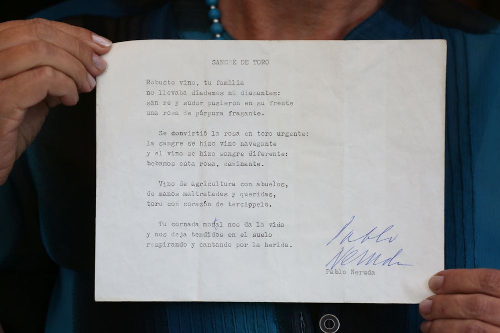 El poema mecanografiado se salvó casi milagrosamente. Neruda y su mujer, Matilde Urrutia, eran muy amigos del abogado Sergio Telteinboim y de su esposa, la licenciada en comercio exterior Perla Grinblatt. Compartían militancia en el Partido Comunista y en los años sesenta, cuando los Telteinboim residían con sus tres hijas en la ciudad de Viña del Mar, asistían con frecuencia a las comidas y las famosas fiestas que Neruda realizaba en su casa de Valparaíso, La Sebastiana. El poeta agasajaba a sus invitados con bebida, buena mesa y versos inéditos, que regalaba en pequeños papelitos que hoy son un tesoro: “Cualquier manuscrito o mecanuscrito suyo que tengamos en nuestra posesión, como este de Sangre de toro, es una joya”, señala el profesor Rojo.