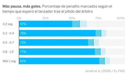 Son los mismo datos que daba Jordet en un trabajo de 2009: los ingleses apenas esperaban 0,3 segundos antes de disparar. Eran los más impacientes, muy cerca de los españoles. En cambio, los alemanes se tomaban el doble de tiempo y los franceses, el triple. (Este patrón también lo menciona el periodista Ben Lyttleton en su libro Twelve Yards, dedicado a los penaltis).