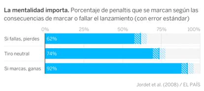 7. Es más fácil tirar para ganar que para no perder. Los jugadores solo convierten en gol el 62% de los penaltis cuando necesitan marcar para no perder inmediatamente la tanda (por ejemplo, cuando vas perdiendo y eres el segundo en lanzar el quinto penalti). En esos momentos se ven más señales de nervios, como preparaciones cortas y miradas al suelo. En cambio, los penaltis decisivos para ganar se transformaron con éxito el 92% de las veces.