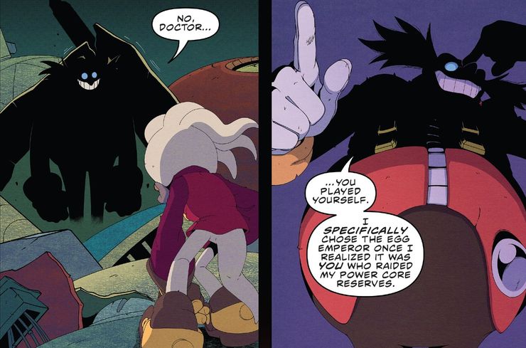 Aunque es muy efectivo, el discurso de Eggman, donde documenta con gran detalle todas las formas en que burló a Starline a pesar de las incesantes intrigas de su aprendiz, palidece en comparación con la forma en que Thomas interpreta a Eggman de manera inquietante. Su figura sombría que emerge de los escombros sirve como una introducción adecuada a lo que pronto sigue, acompañada por la sonrisa siniestra que se extiende por su rostro oscurecido y sus ojos inquietantemente pequeños y brillantes. El siguiente panel embellece estas cualidades inquietantes, mientras Eggman se eleva sobre su víctima. Sonic ha estado incursionando en una estética de terror que recuerda a Cinco noches en freddy’s últimamente, y aquí Robotnik es realmente imponente no a pesar del estilo de arte caricaturesco, sino por eso.