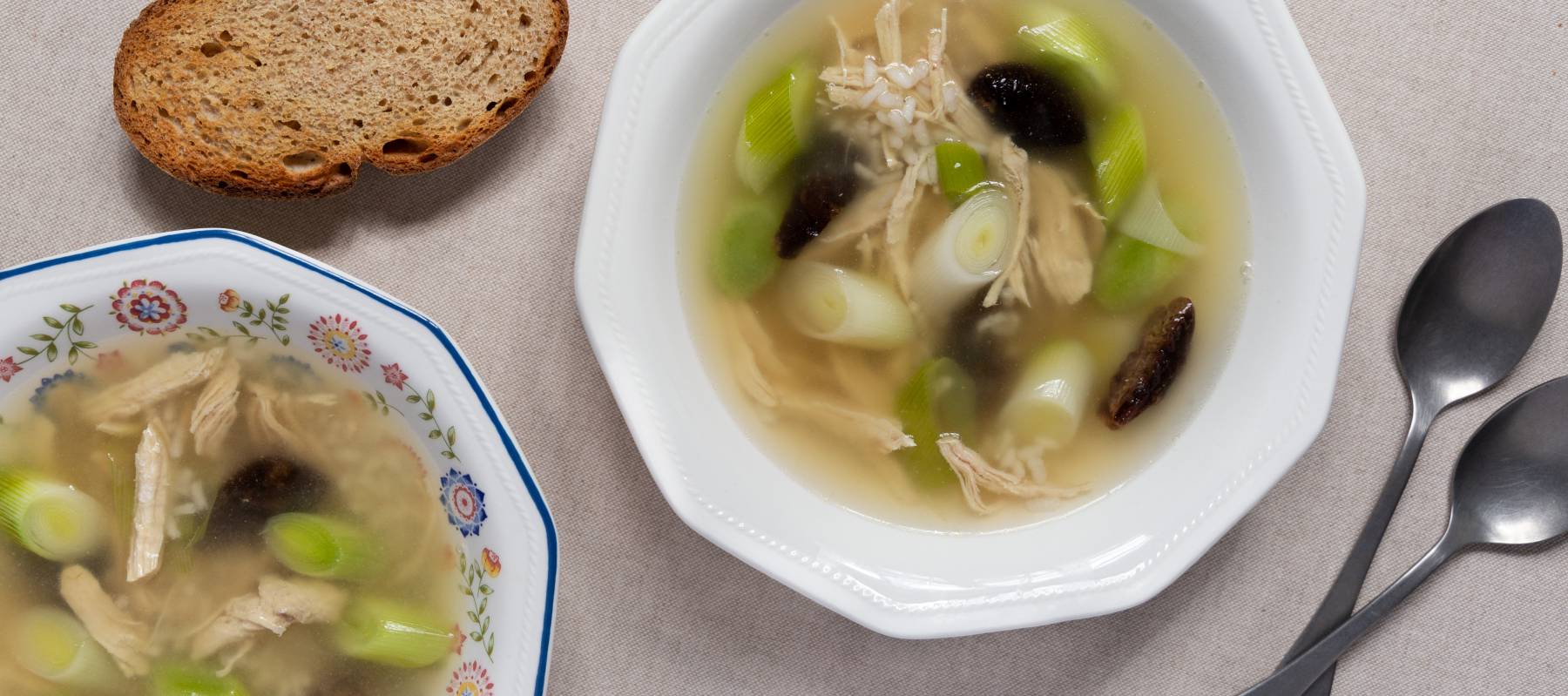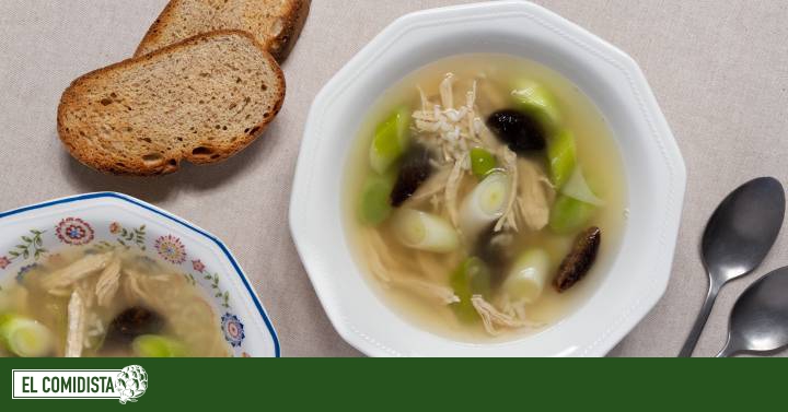 Un gallo en el final de sus días no es algo que todos tengamos a mano, así que lo sustituiremos por pollo normal y corriente. Respecto al resto de ingredientes, exceptuando el puerro, existen variantes: hay quienes añaden los menudillos del pollo al caldo, quienes utilizan patata o cebada para darle contundencia a la sopa en lugar de arroz, y quienes optan por no poner las ciruelas pasas -aunque, desde mi punto de vista, le dan un punto buenísimo al plato.