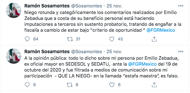 “Este asunto es toda una novela mal hecha, realmente me obligó incluso a enviar un tuit de inmediato, negando toda esa participación que dice (Emilio) Zebadúa ante el Ministerio Público, negándolo totalmente. Hay cosas hasta de veras medio ridículas; eso de que si no estuvo en las reuniones ¿cómo supo lo que hablamos? ah que porque se lo dijo Rosario Robles o se lo dije yo, lo cual es totalmente absurdo. Suena muy mal consejero quien le haya dicho que hiciera esa novela, ese complot, que detalla en esa declaración y una a una se va a venir viniendo abajo, de esas mentiras, porque el asunto es que Zebadúa quiere engañar a la Fiscalía (FGR)”, sostuvo Ramón Sosamontes Herreramoro, exjefe de la Oficina de la Secretaría de Desarrollo Social (Sedesol) y asesor y Vocero en la de Desarrollo Agrario, Territorial y Urbano (Sedatu) durante las gestiones de Rosario Robles Berlanga.