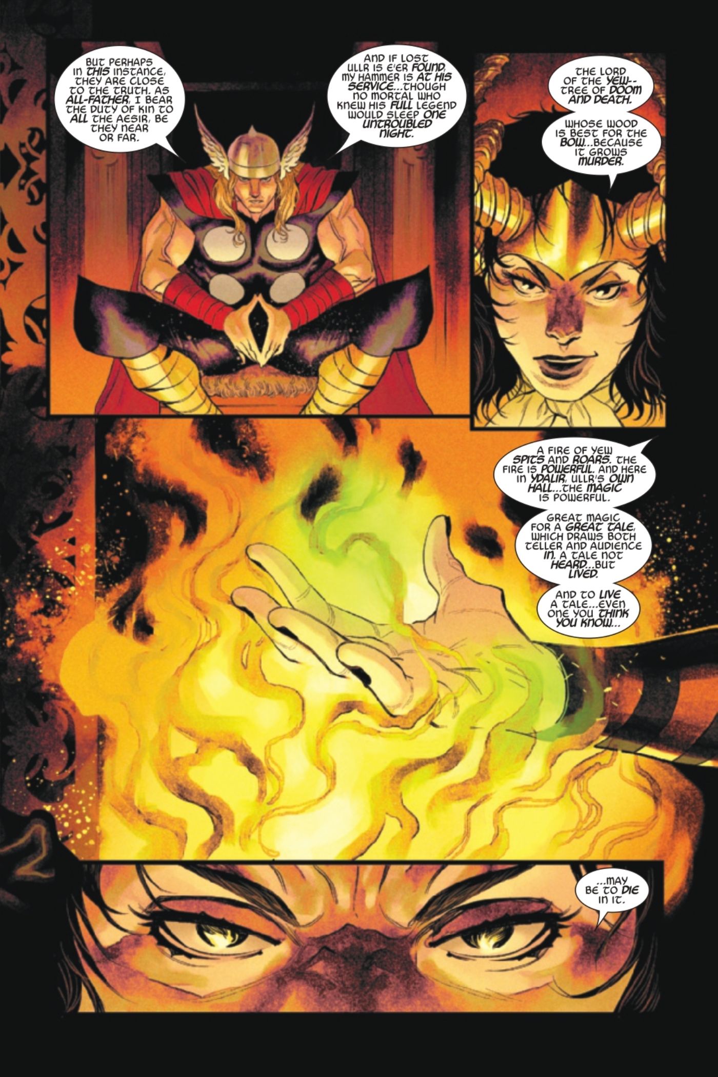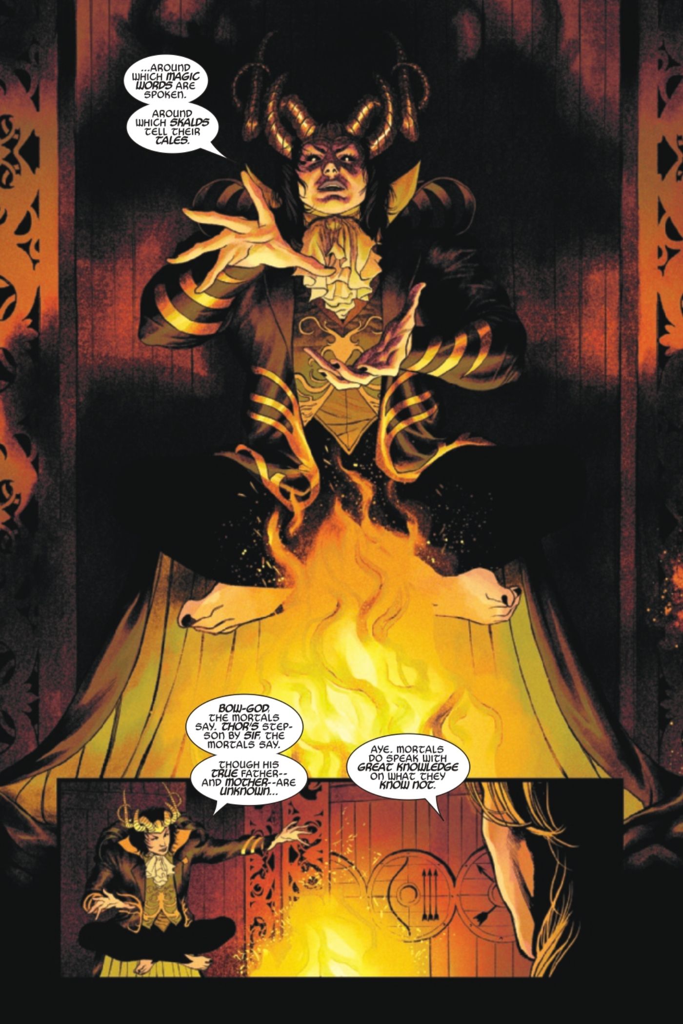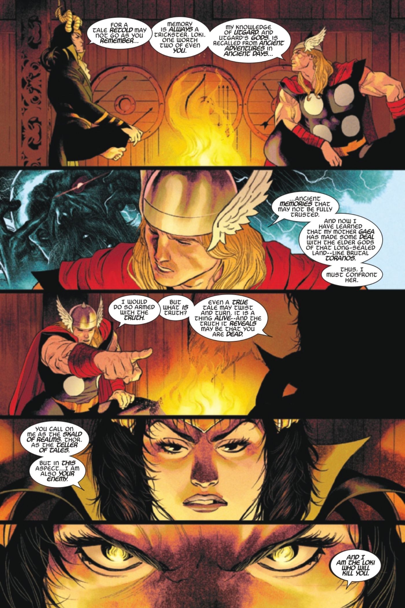 Como los lectores pueden deducir rápidamente, Thor no está más cerca de la verdad cuando está sentado con Loki que cuando estaba luchando contra Toranos. Sin embargo, Thor aprende más sobre la nueva posición de Loki como Narrador de Cuentos, así como sobre la naturaleza de su relación. Loki dice: “Yo soy el Loki que te matará.”, de una manera tan natural, que parece como si estuviera escrita en la historia cósmica de sus vidas que sólo Loki puede ver actualmente, una que aparentemente no se puede cambiar.