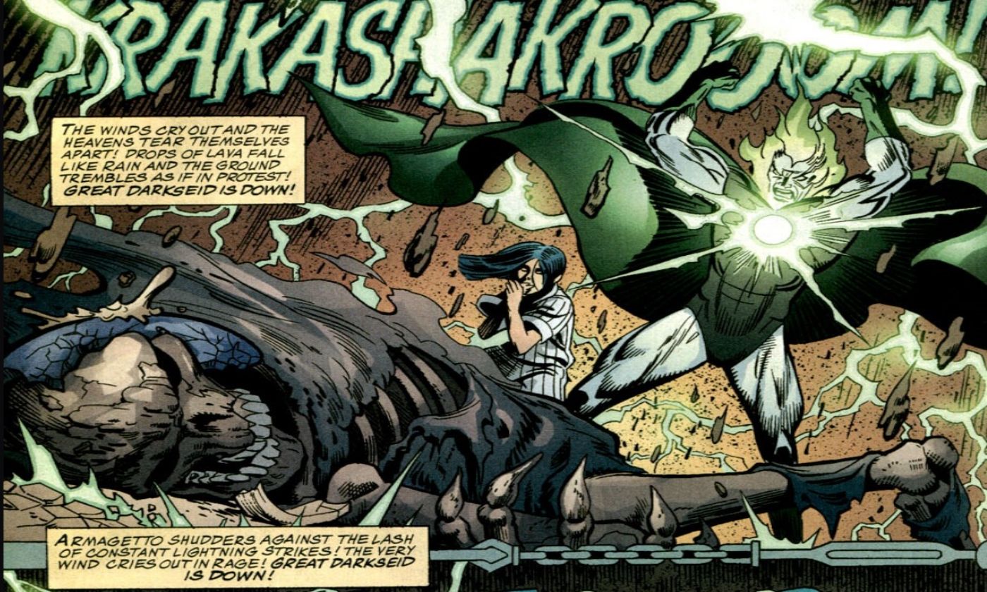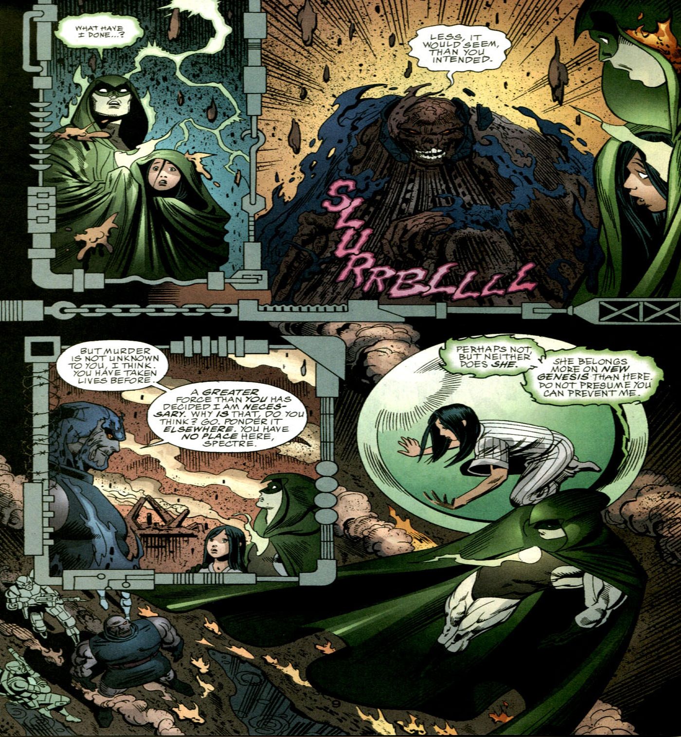 - El Espectro, un héroe poderoso, intentó castigar a Darkseid, pero descubre que Darkseid es cósmicamente importante y no puede ser asesinado.